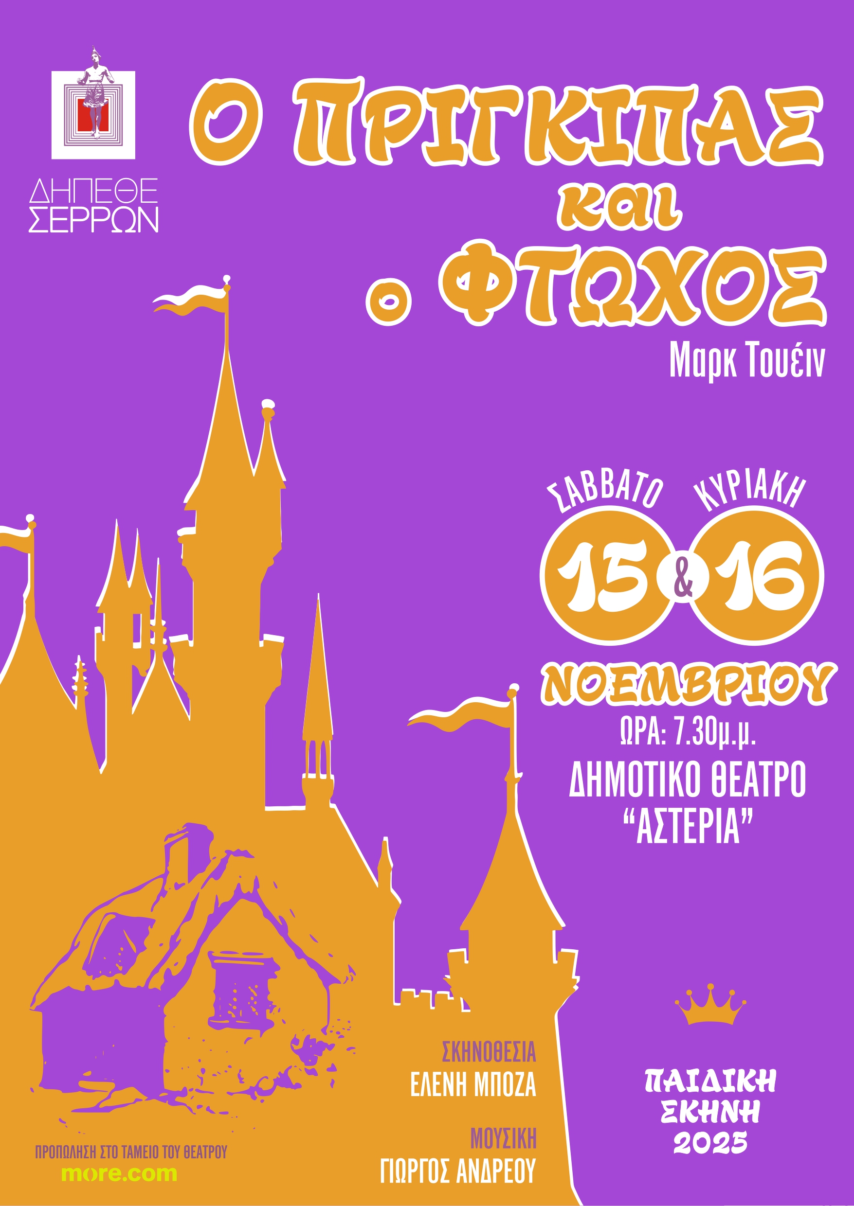 Για την καλλιτεχνική σεζόν 2025 – 2026 η Παιδική Σκηνή του Δημοτικού Περιφερειακού Θεάτρου Σερρών ανανεώνει το ραντεβού της με τους μικρούς και μεγάλους φίλους της, ετοιμάζοντας τη θεατρική μεταφορά του μυθιστορήματος «Ο πρίγκιπας και ο φτωχός» του Μαρκ Τουέιν που θα παρουσιαστεί τους μήνες Νοέμβριο και Δεκέμβριο στην Κεντρική Σκηνή του Δημοτικού Θεάτρου «Αστέρια» Σερρών.